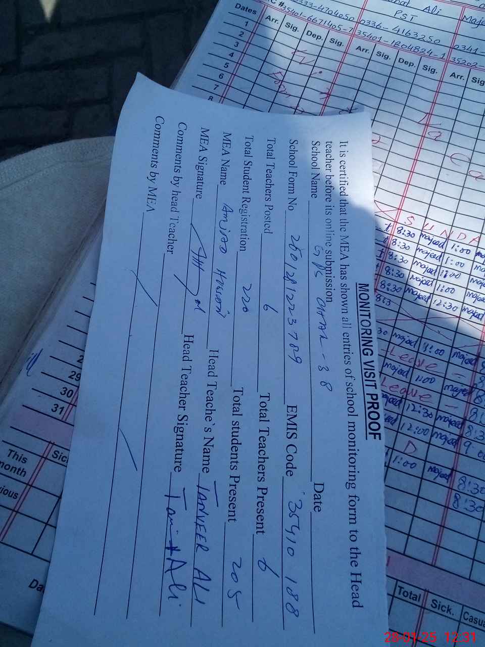 | Attendance Register | Head Teacher | MEA with School | Visit Proof |