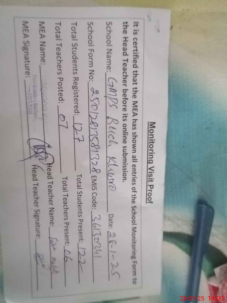 | Attendance Register | Head Teacher | MEA with School | Visit Proof |