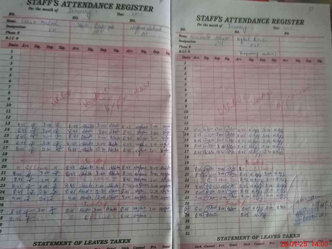 | CNIC | Full Name | Designation | R/C | Absence During Last Calender Month |