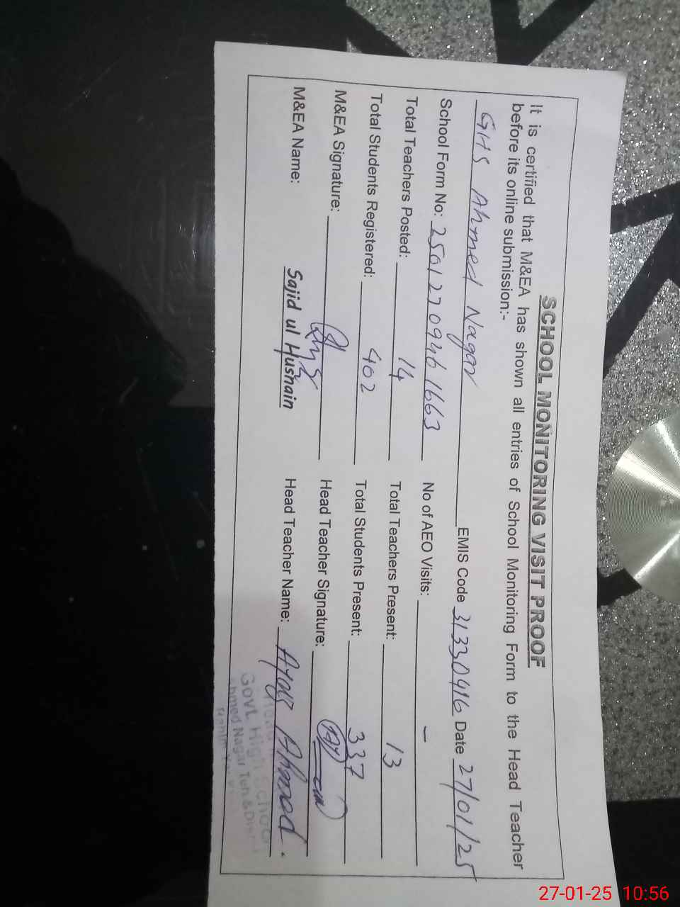 | Attendance Register | Head Teacher | MEA with School | Visit Proof |