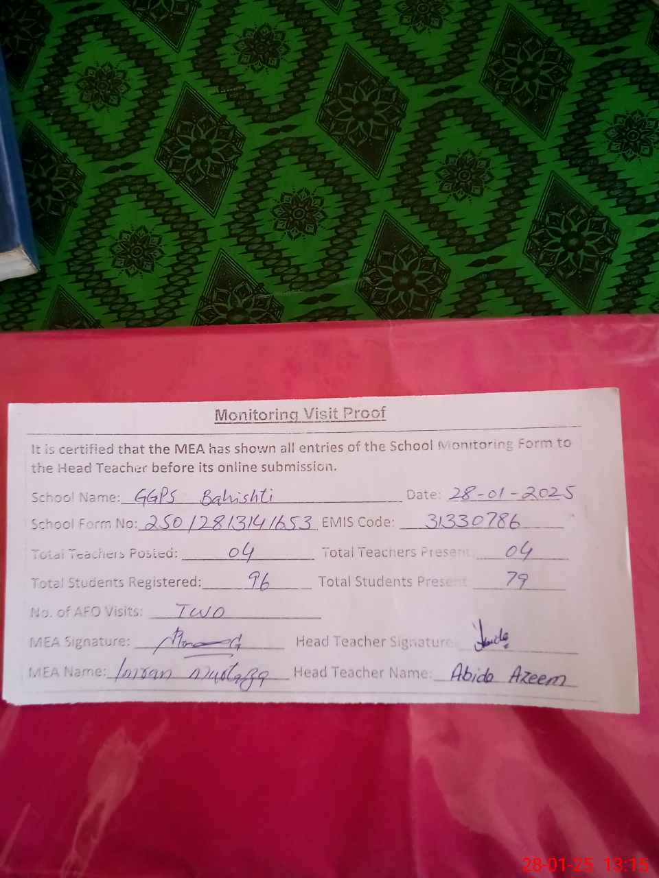 | Attendance Register | Head Teacher | MEA with School | Visit Proof |
