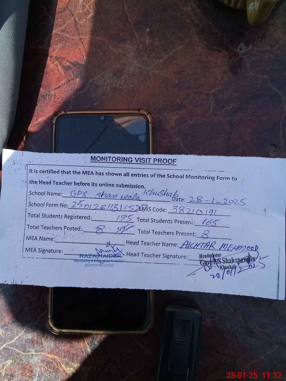 | Attendance Register | Head Teacher | MEA with School | Visit Proof |