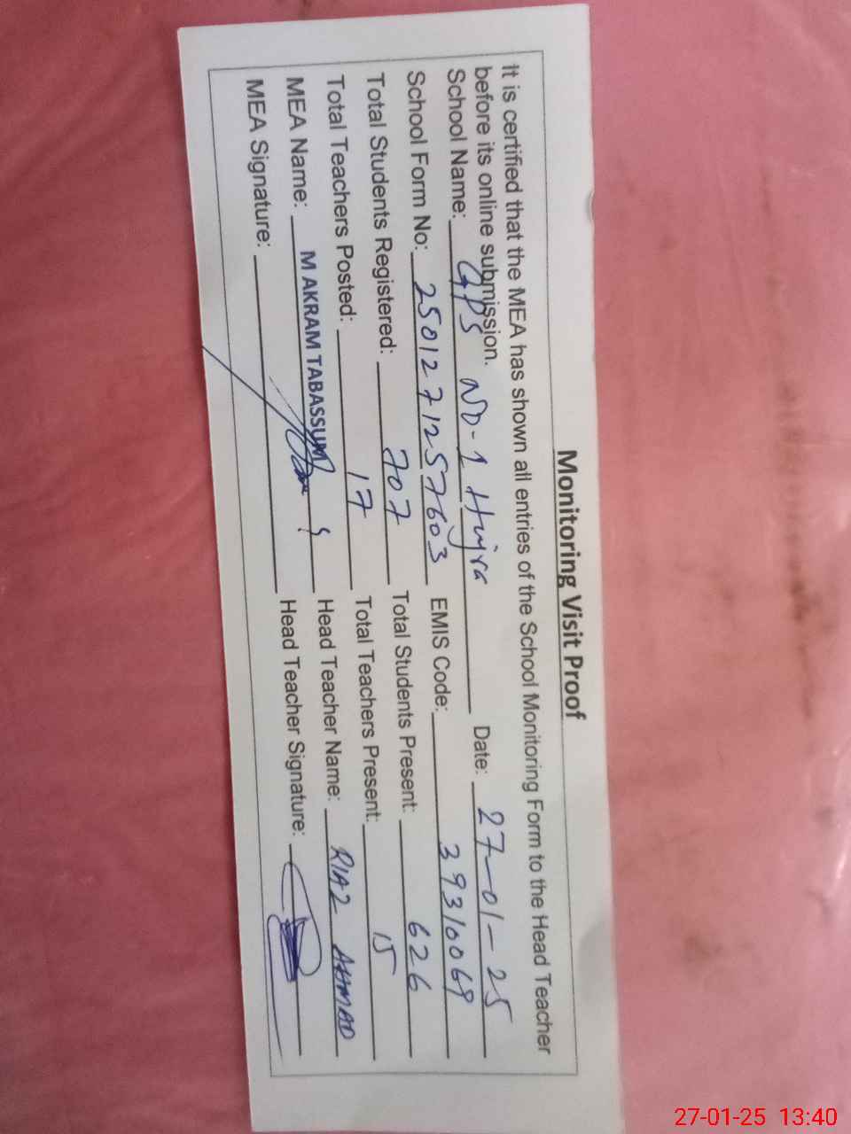 | EMIS Code: 39310069 | Name of School: GPS NO. 1 HUJRA | |||