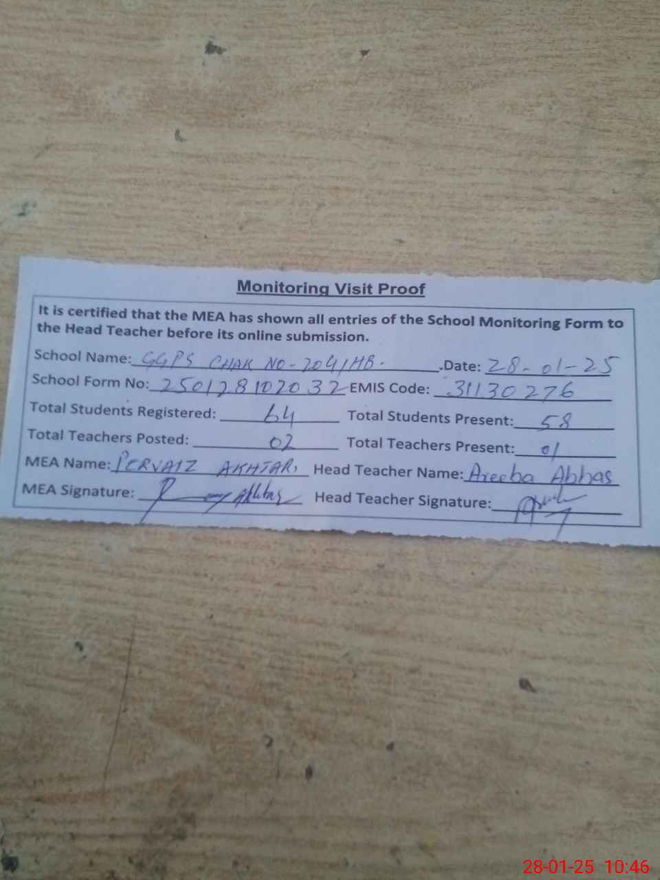 | Attendance Register | Head Teacher | MEA with School | Visit Proof |