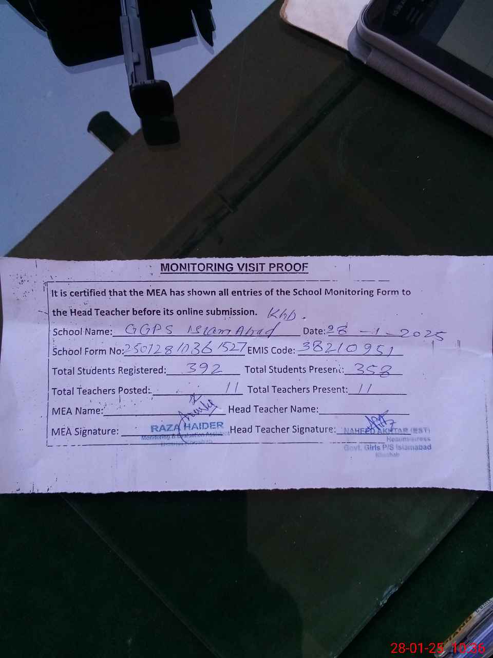 | Attendance Register | Head Teacher | MEA with School | Visit Proof |