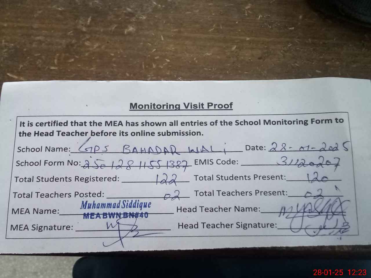 | EMIS Code: 31120207 | Name of School: GPS BAHADAR WALI | |||