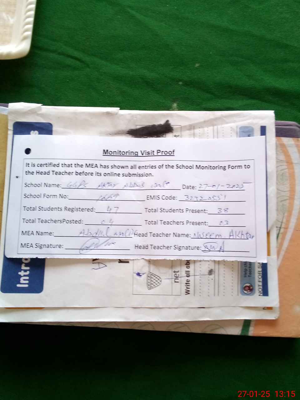 | Attendance Register | Head Teacher | MEA with School | Visit Proof |