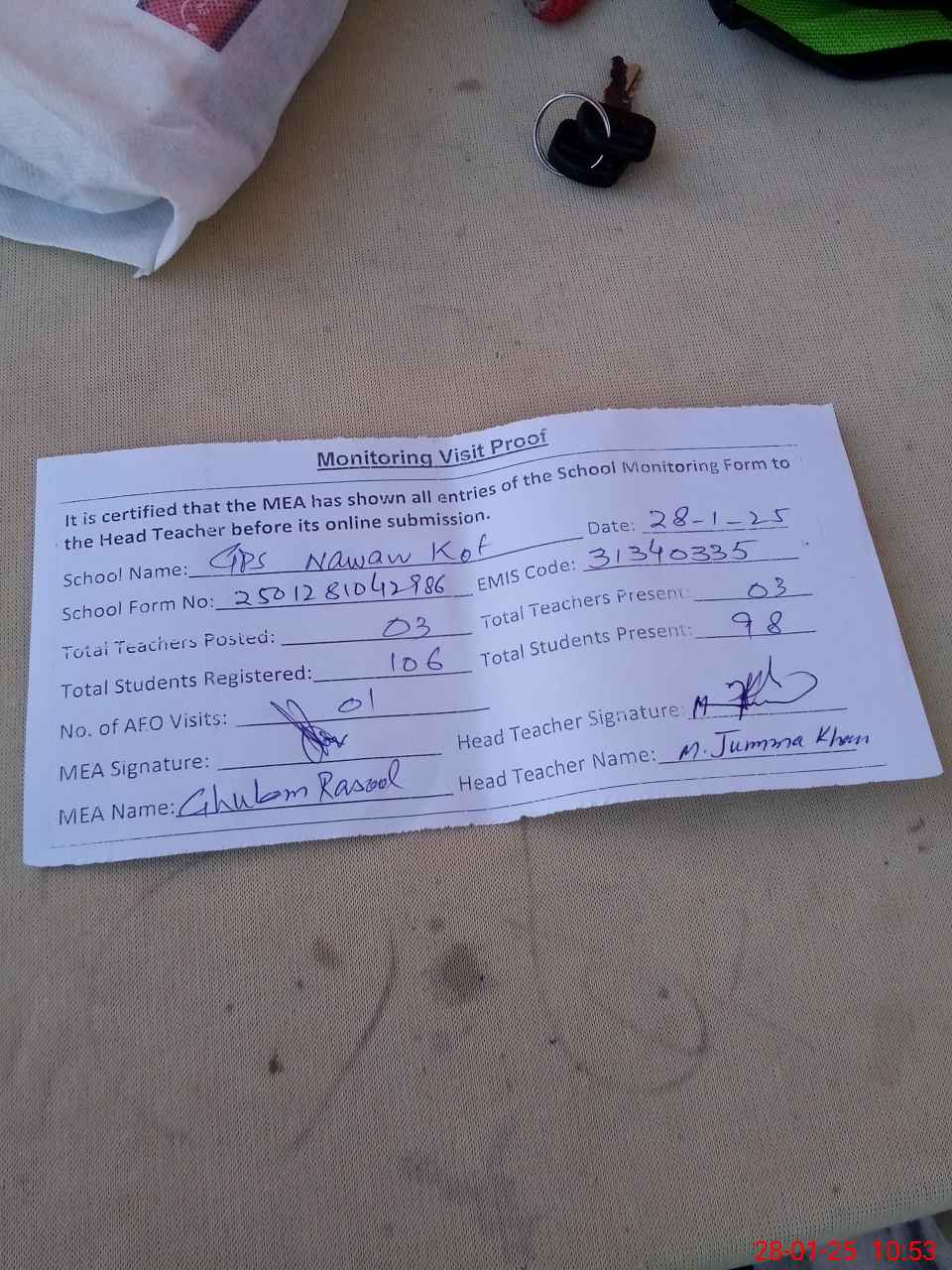| Attendance Register | Head Teacher | MEA with School | Visit Proof |