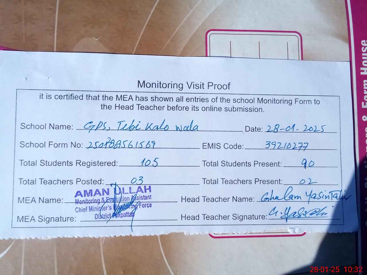 | Attendance Register | Head Teacher | MEA with School | Visit Proof |