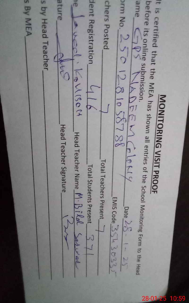 | EMIS Code: 35430335 | Name of School: GPS NADEEM COLONY FAROOQABAD | |||
