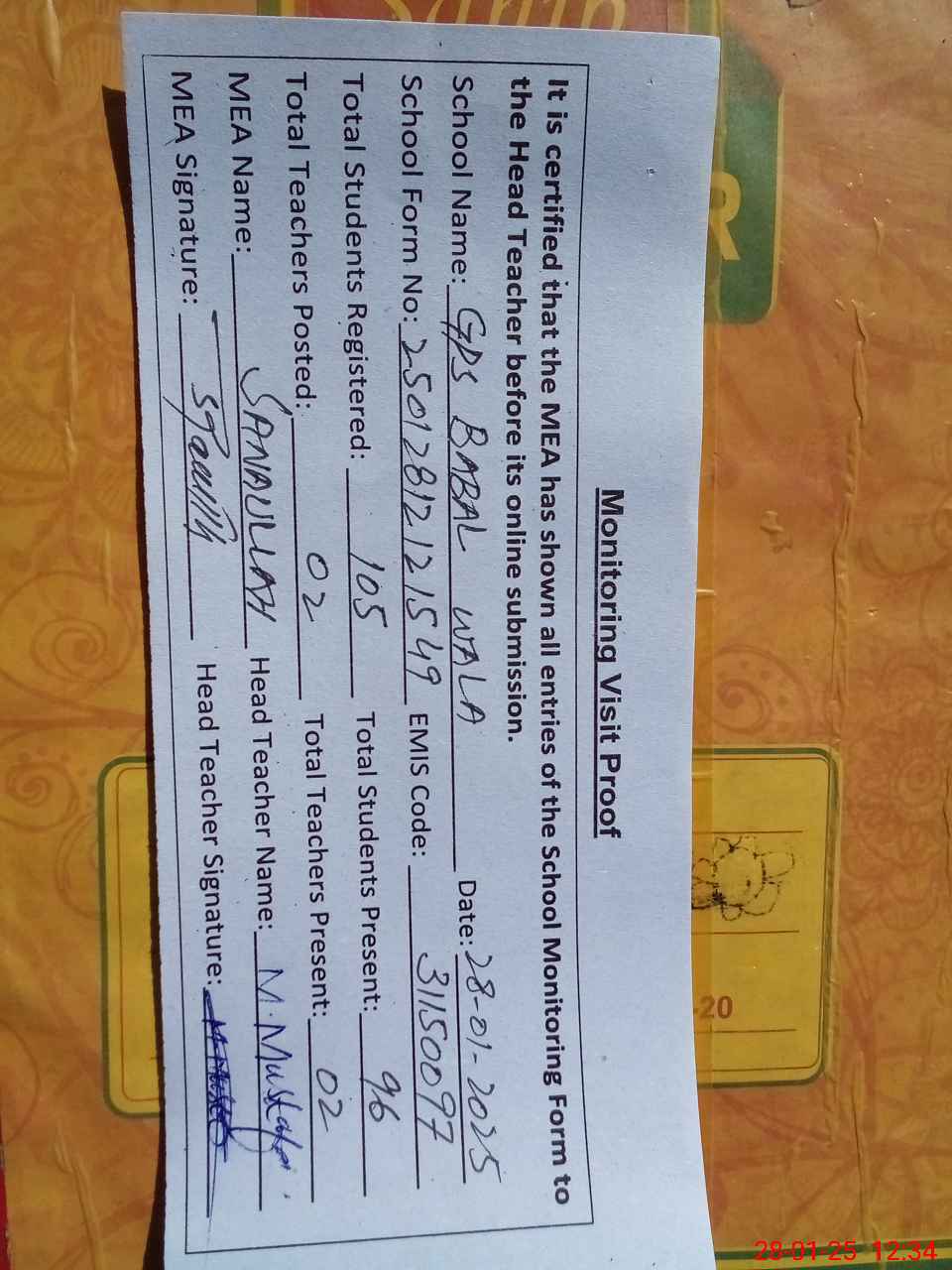 | EMIS Code: 31150097 | Name of School: GPS BABAL WALA | |||