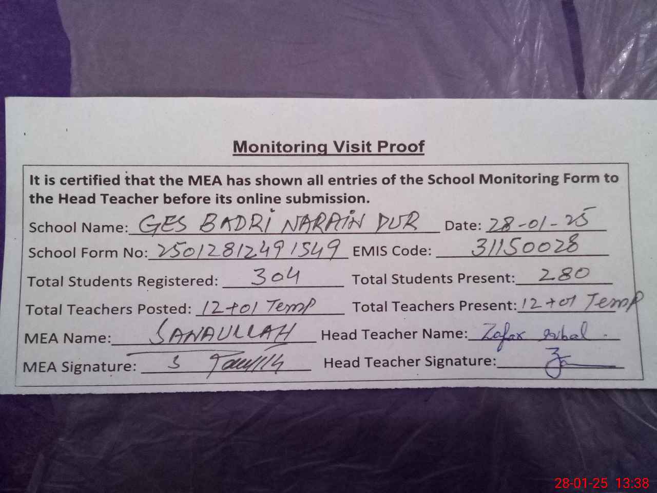 | EMIS Code: 31150028 | Name of School: GES BADRI NARIEN PUR | |||