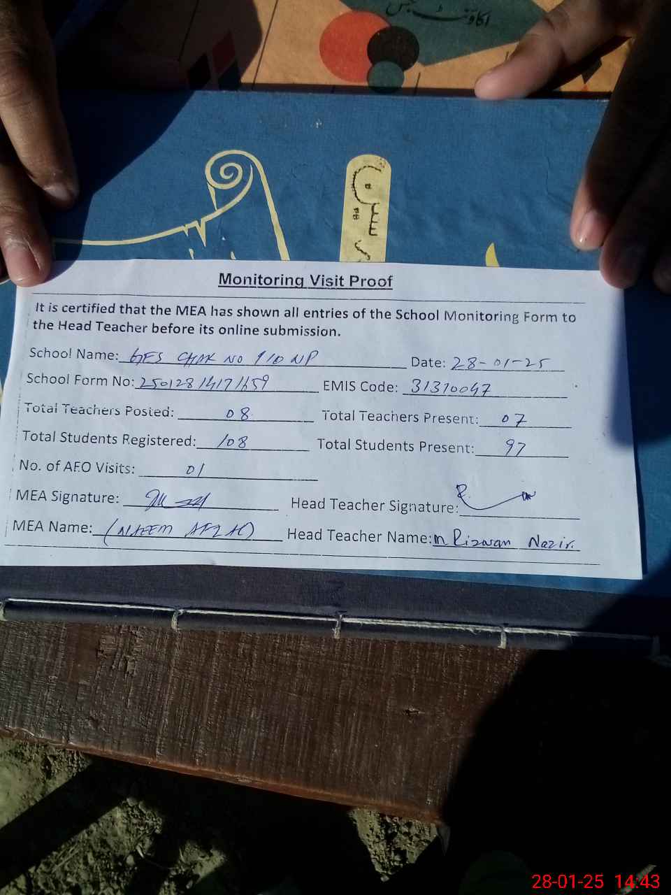 | Attendance Register | Head Teacher | MEA with School | Visit Proof |