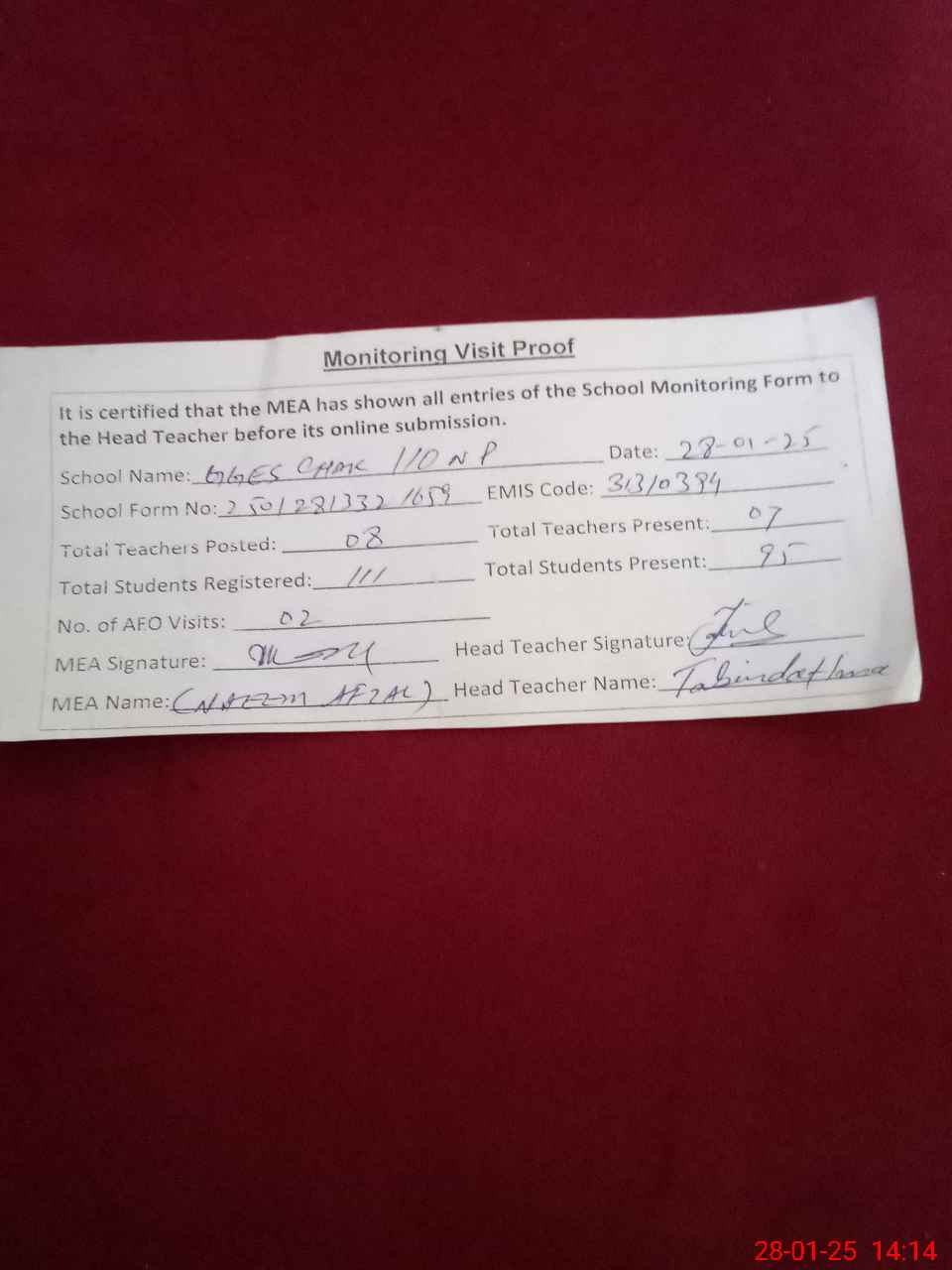 | Attendance Register | Head Teacher | MEA with School | Visit Proof |