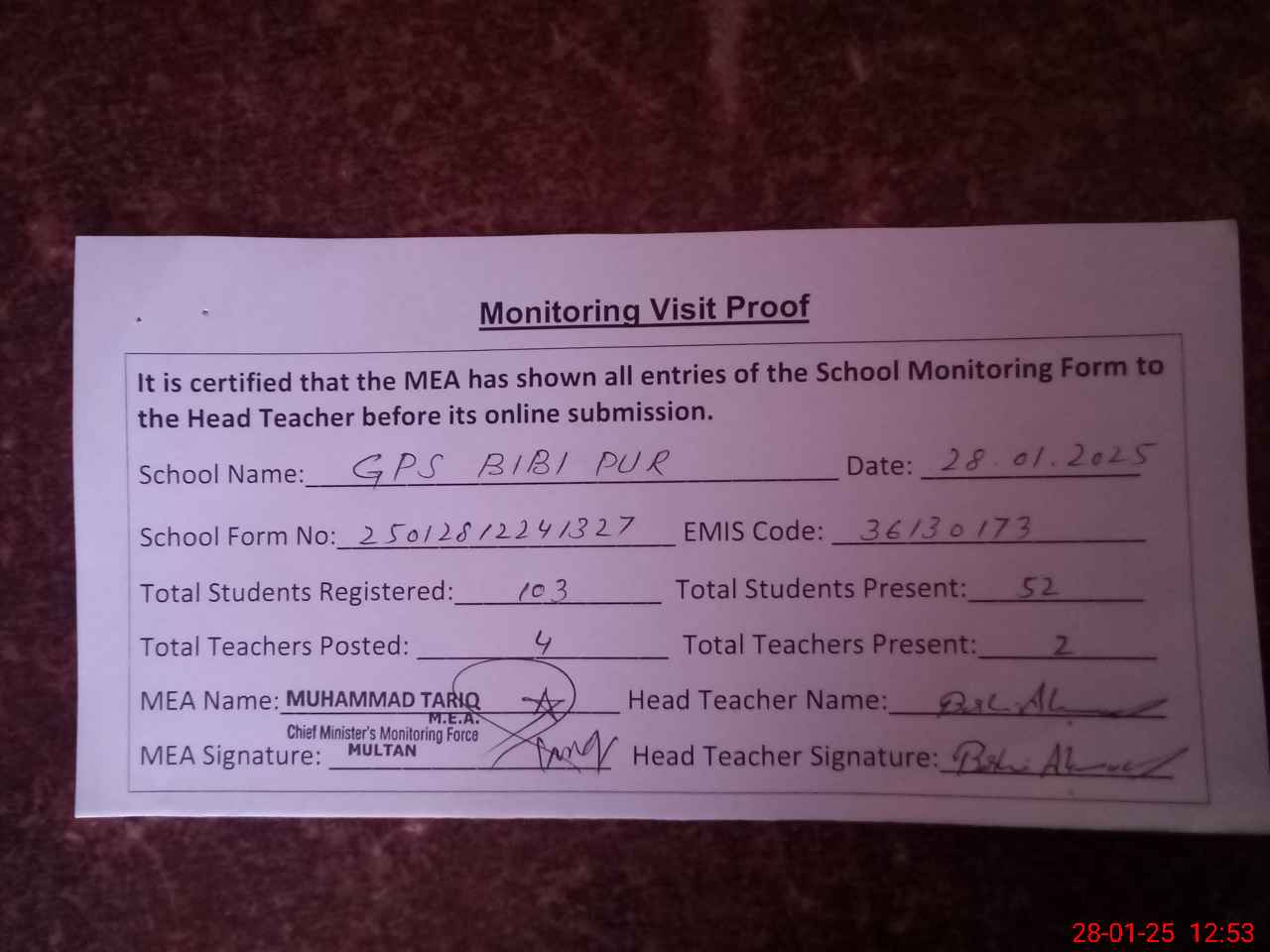 | EMIS Code: 36130173 | Name of School: GPS BIBI PUR MARDAN PUR MULTAN | |||