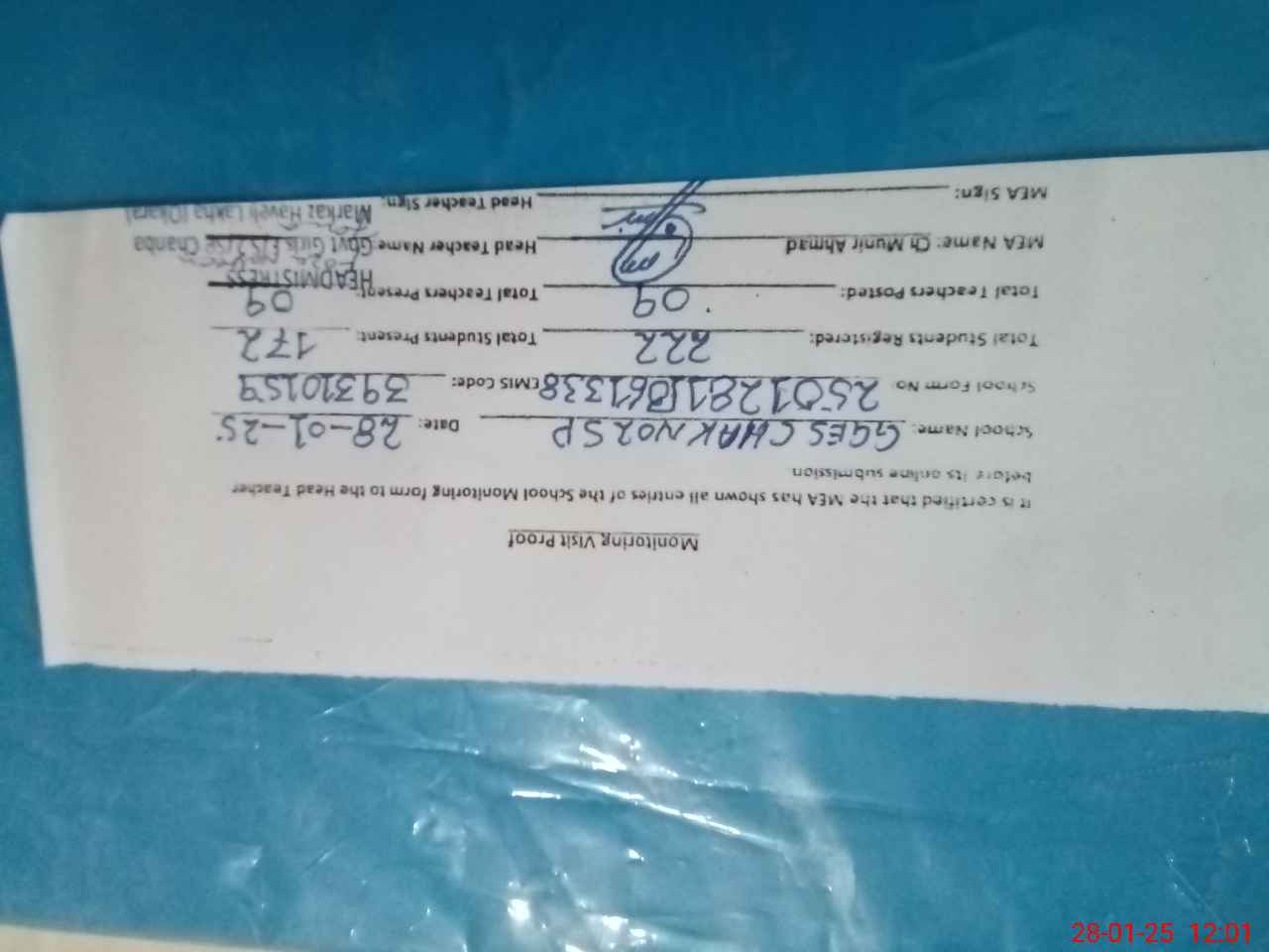 | Attendance Register | Head Teacher | MEA with School | Visit Proof |