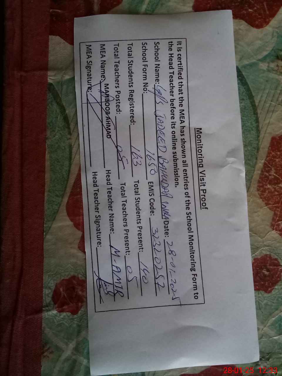 | EMIS Code: 32320257 | Name of School: GPS JADEED BAHADUR WALA | |||