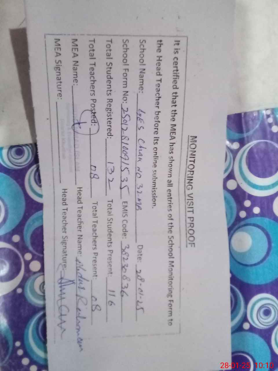 | Attendance Register | Head Teacher | MEA with School | Visit Proof |