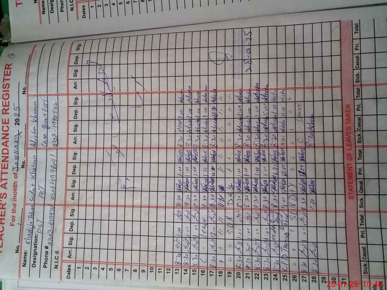 | Name: Kh**** Ta**** Designation: (School Headmaster's/Headmistress's) PST/PTC/JV Phone/Cell Number: 03**** |