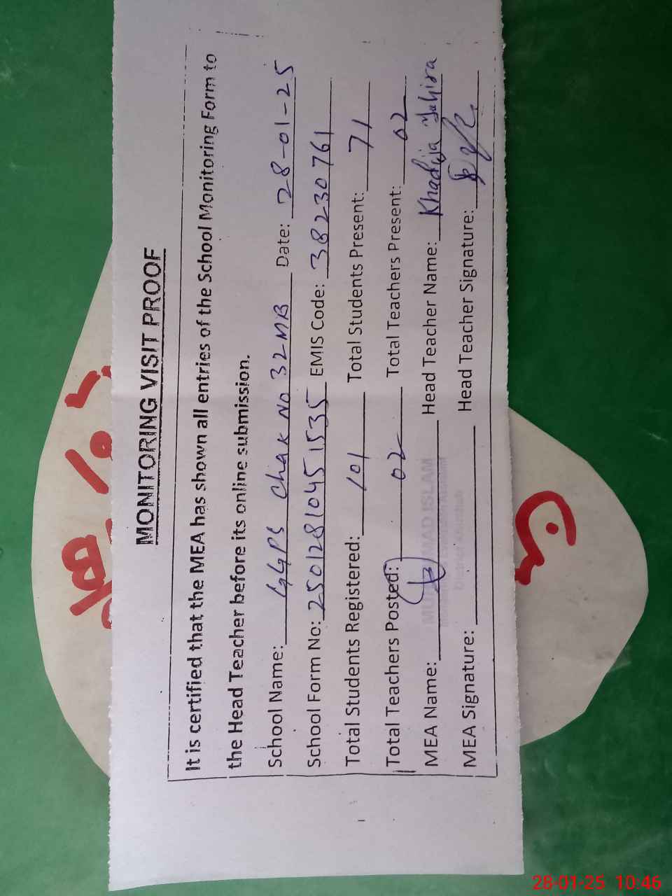 | Attendance Register | Head Teacher | MEA with School | Visit Proof |