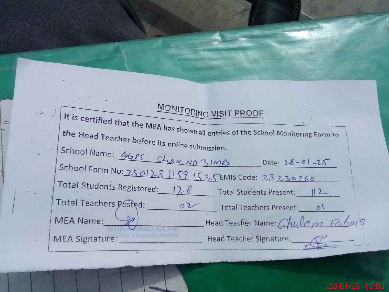 | EMIS Code: 38230760 | Name of School: GGPS CHAK NO 31 MB | |||