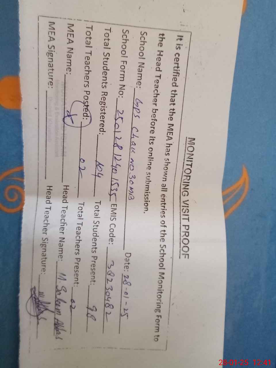 | EMIS Code: 38230482 | Name of School: GPS CHAK NO. 30 MB | |||