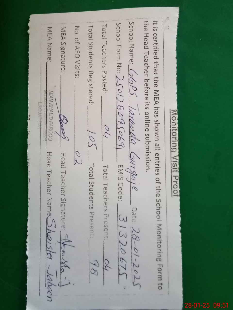 | Attendance Register | Head Teacher | MEA with School | Visit Proof |