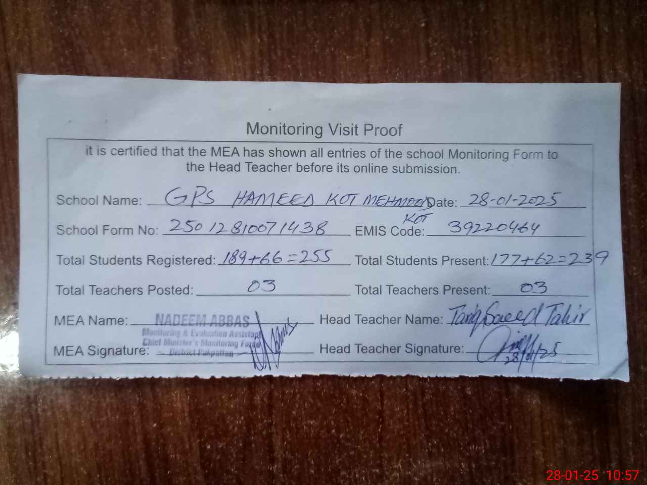 | EMIS Code: 39220464 | Name of School: GPS HAMEED KOT (MEHMOOD KOT) | |||