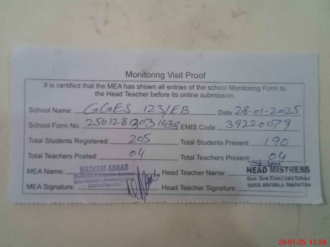 | Attendance Register | Head Teacher | MEA with School | Visit Proof |