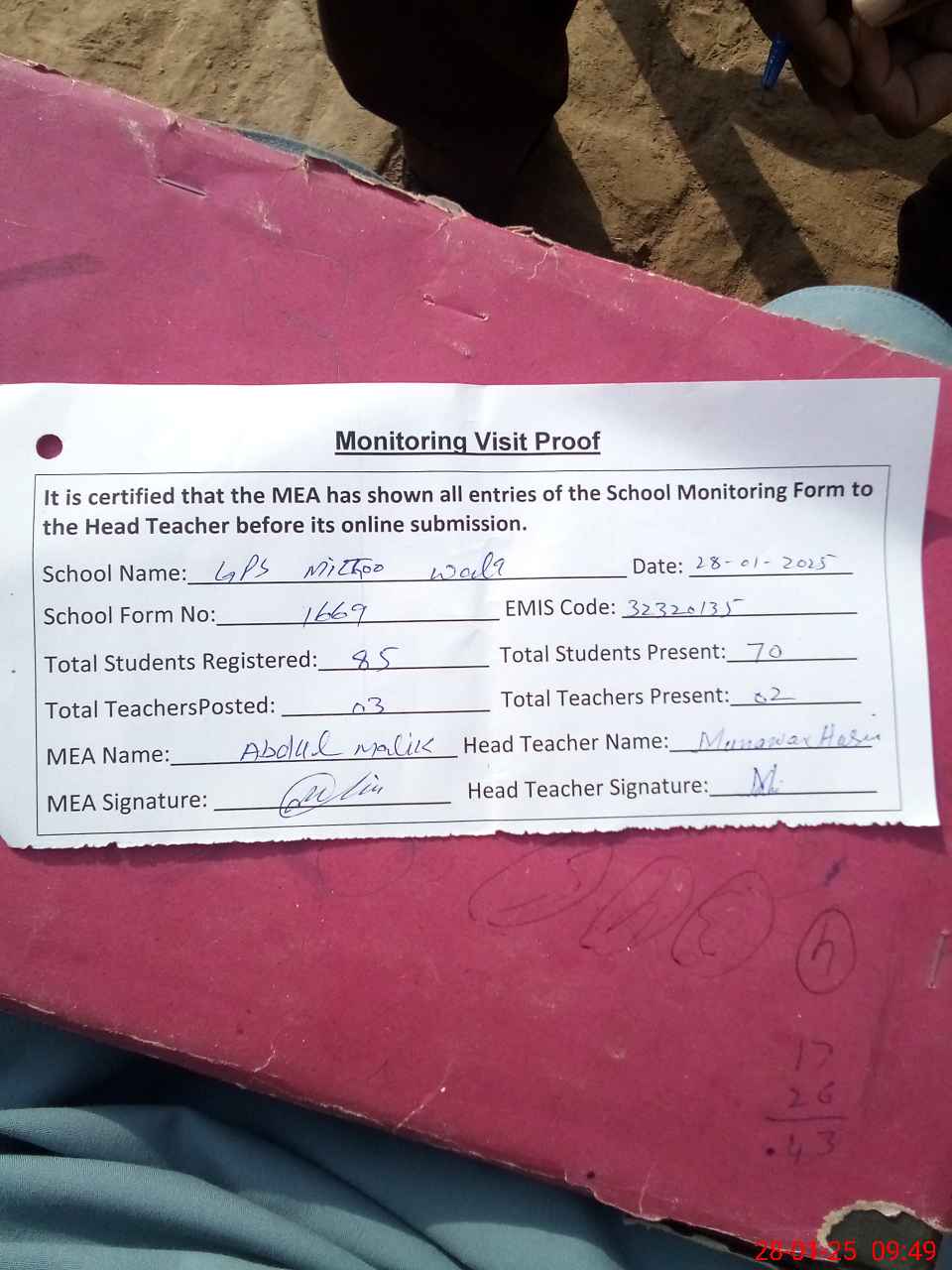 | Attendance Register | Head Teacher | MEA with School | Visit Proof |