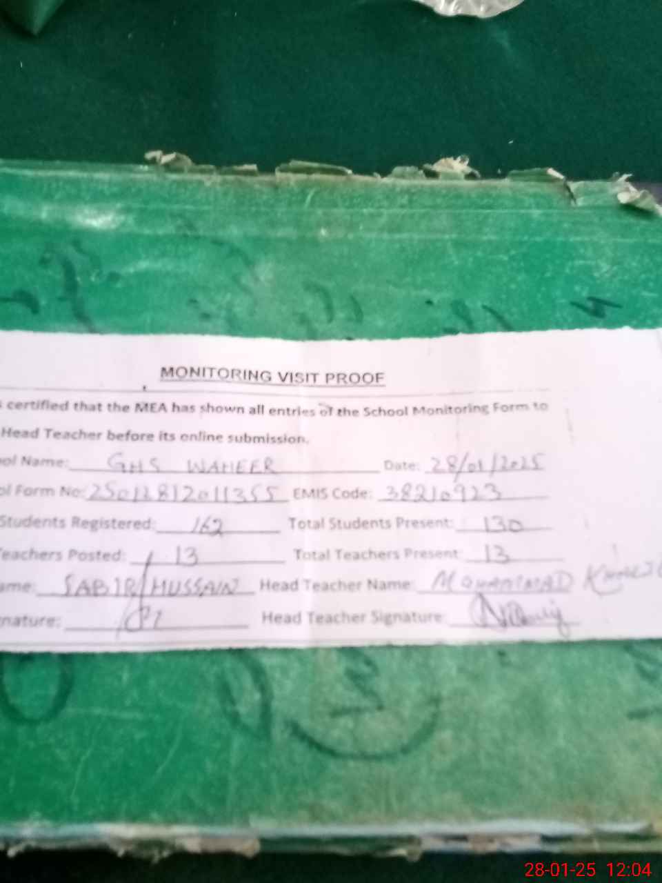 | Attendance Register | Head Teacher | MEA with School | Visit Proof |