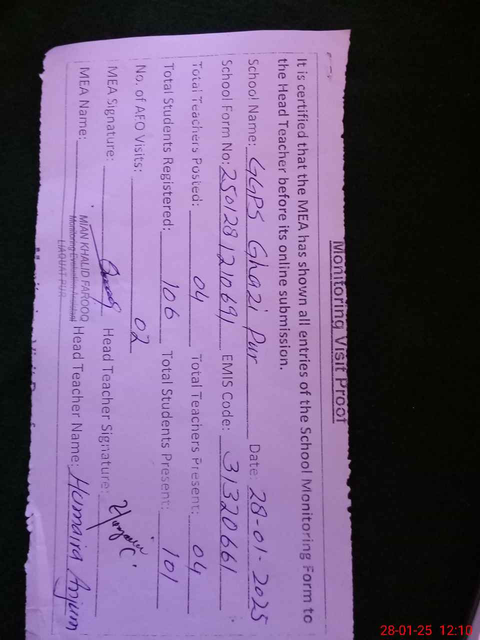| Attendance Register | Head Teacher | MEA with School | Visit Proof |