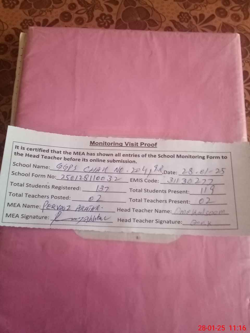 | Attendance Register | Head Teacher | MEA with School | Visit Proof |