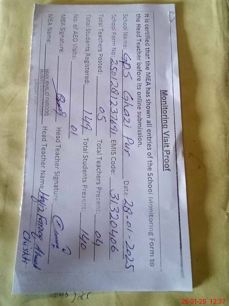 | Attendance Register | Head Teacher | MEA with School | Visit Proof |