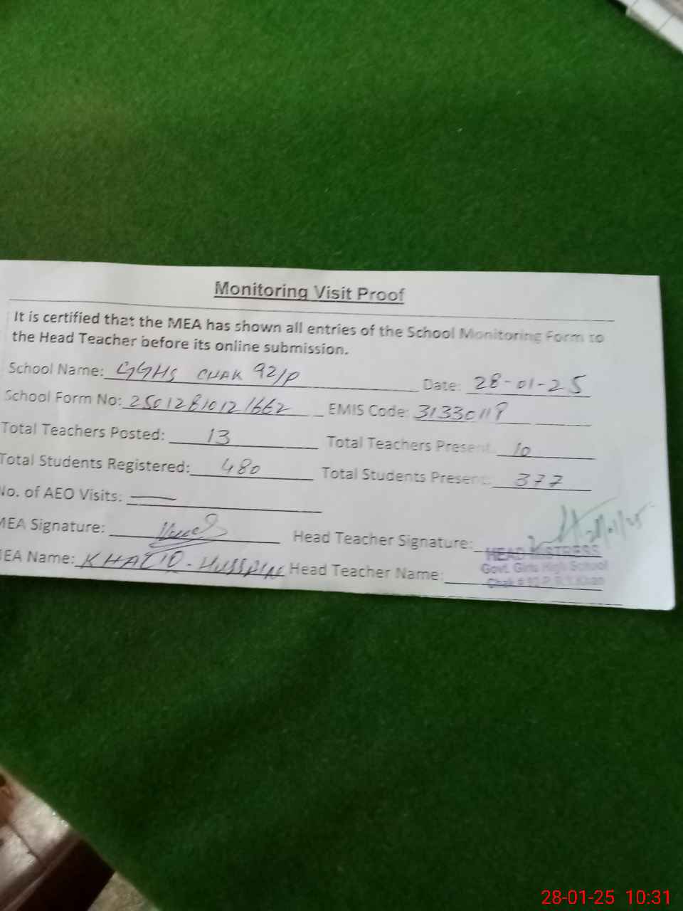 | EMIS Code: 31330119 | Name of School: GGHS CHAK NO. 92/P | |||