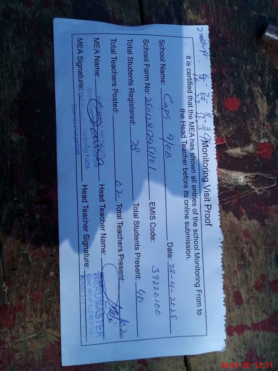 | Attendance Register | Head Teacher | MEA with School | Visit Proof |