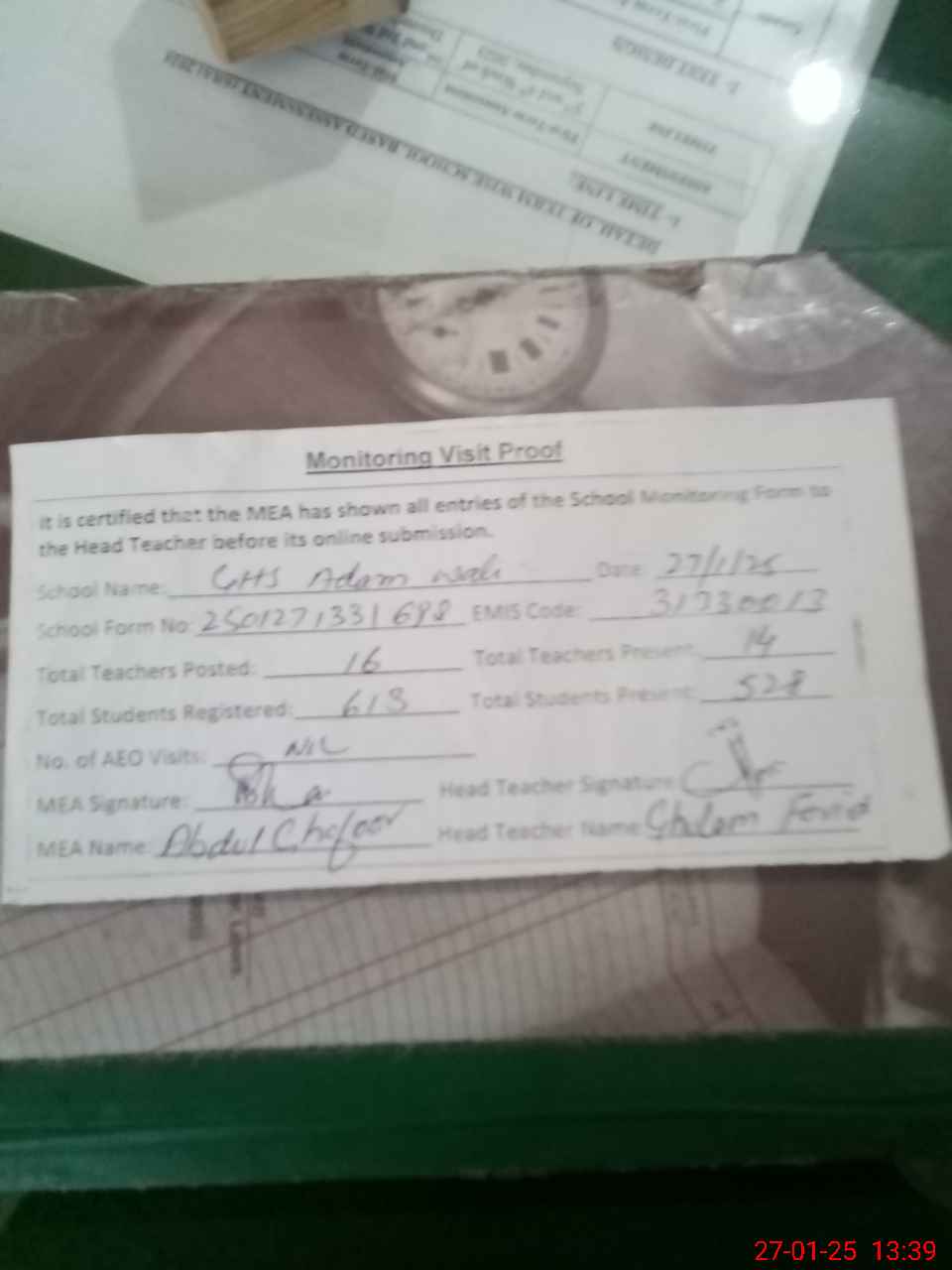 | Attendance Register | Head Teacher | MEA with School | Visit Proof |