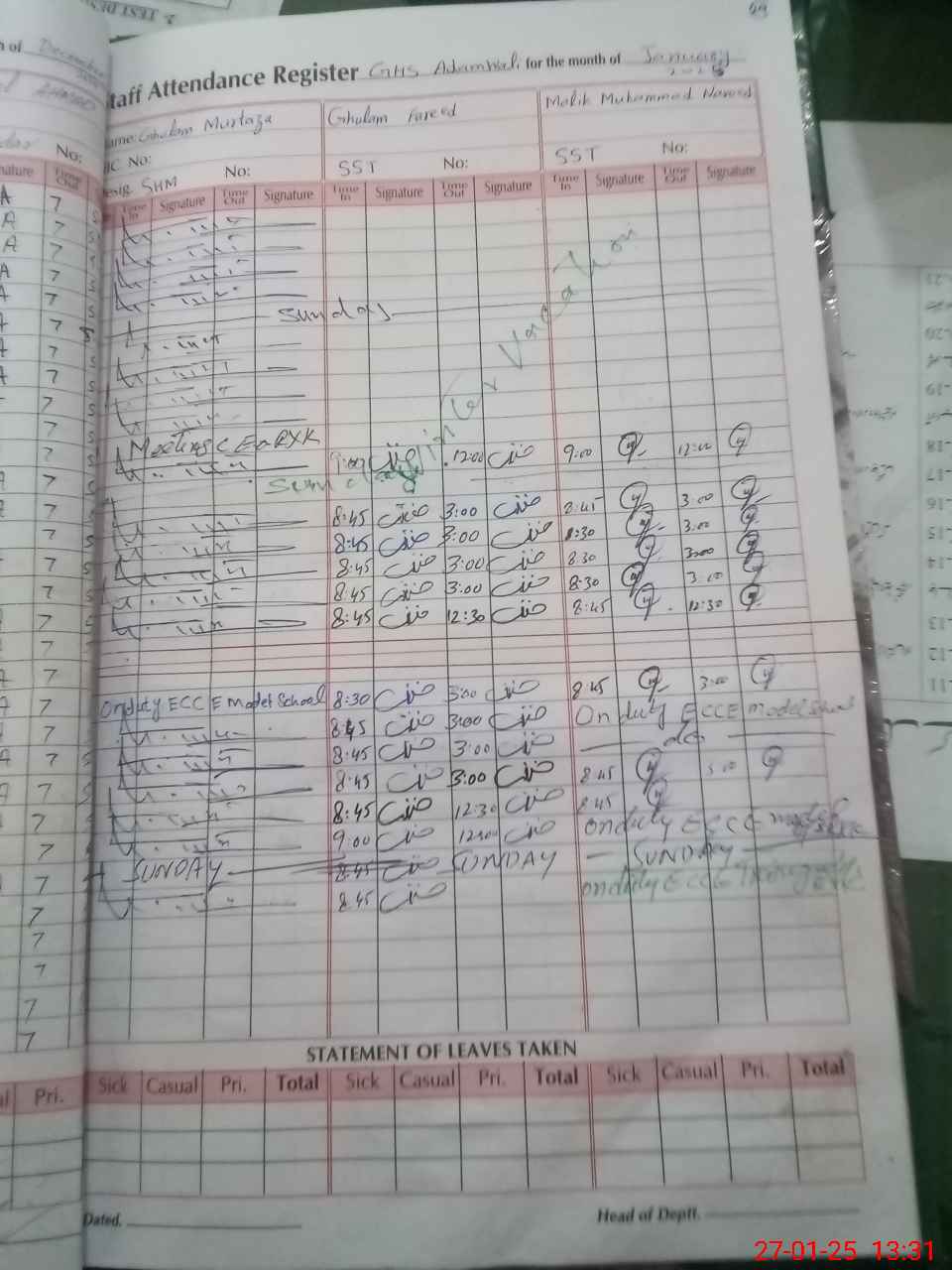 | CNIC | Full Name | Designation | R/C | Absence During Last Calender Month |
