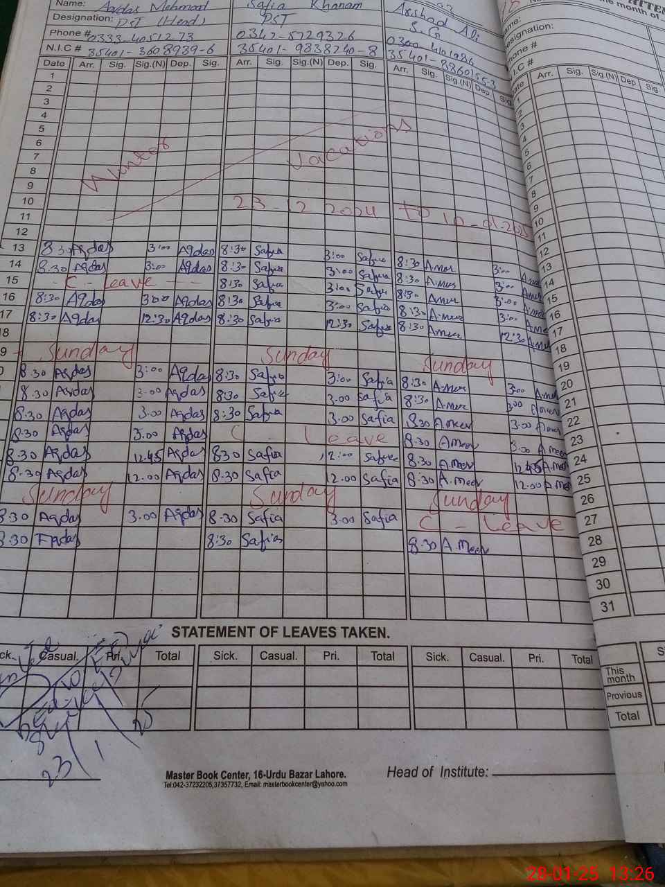 | CNIC | Full Name | Designation | R/C | Absence During Last Calender Month |