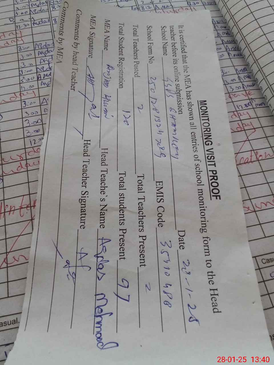 | Attendance Register | Head Teacher | MEA with School | Visit Proof |