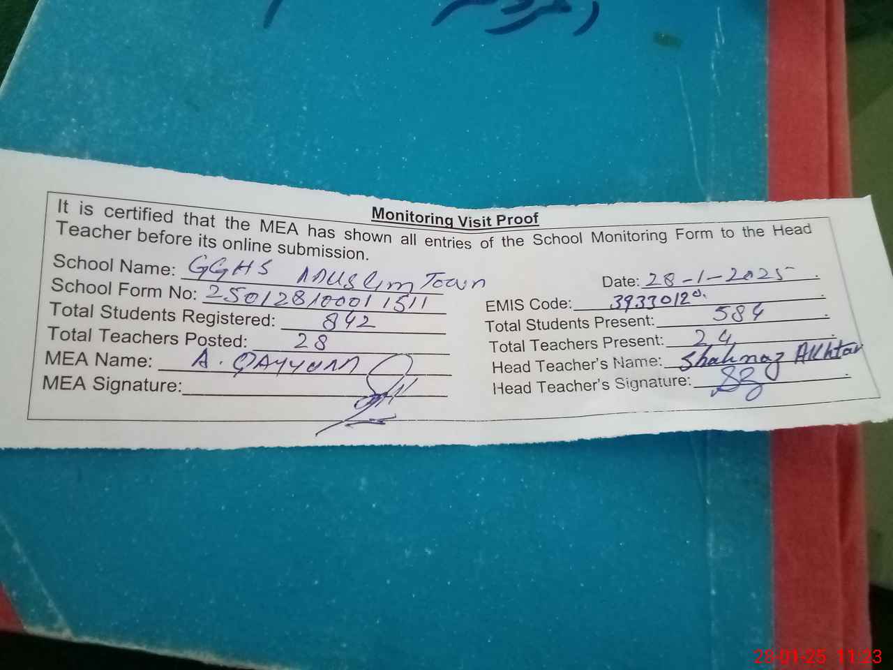 | Attendance Register | Head Teacher | MEA with School | Visit Proof |