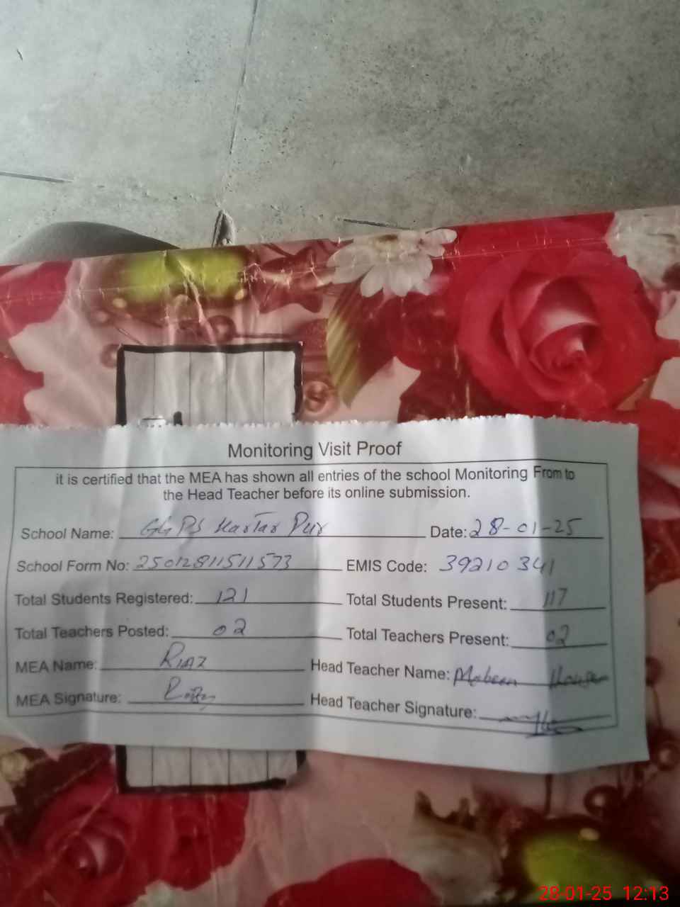 | Attendance Register | Head Teacher | MEA with School | Visit Proof |