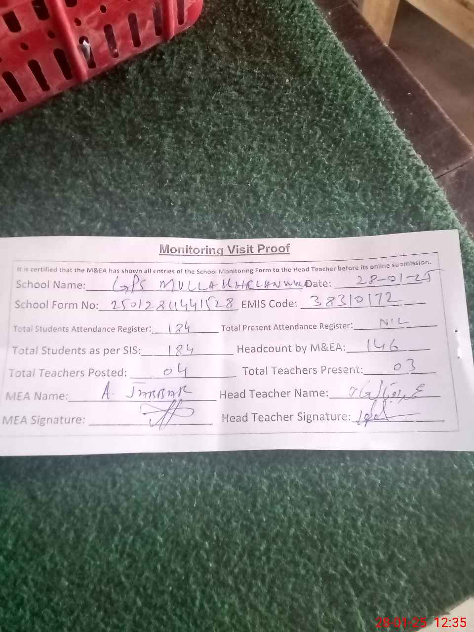 | Attendance Register | Head Teacher | MEA with School | Visit Proof |