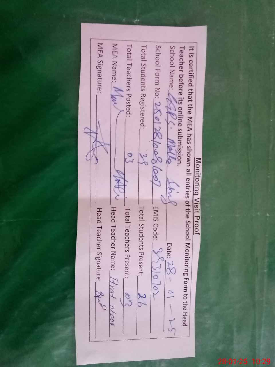 | Attendance Register | Head Teacher | MEA with School | Visit Proof |