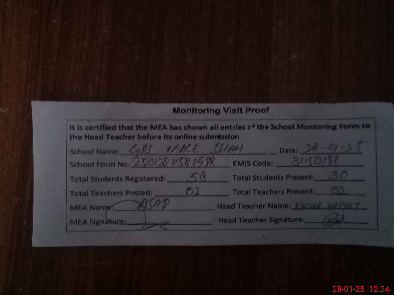 | Attendance Register | Head Teacher | MEA with School | Visit Proof |