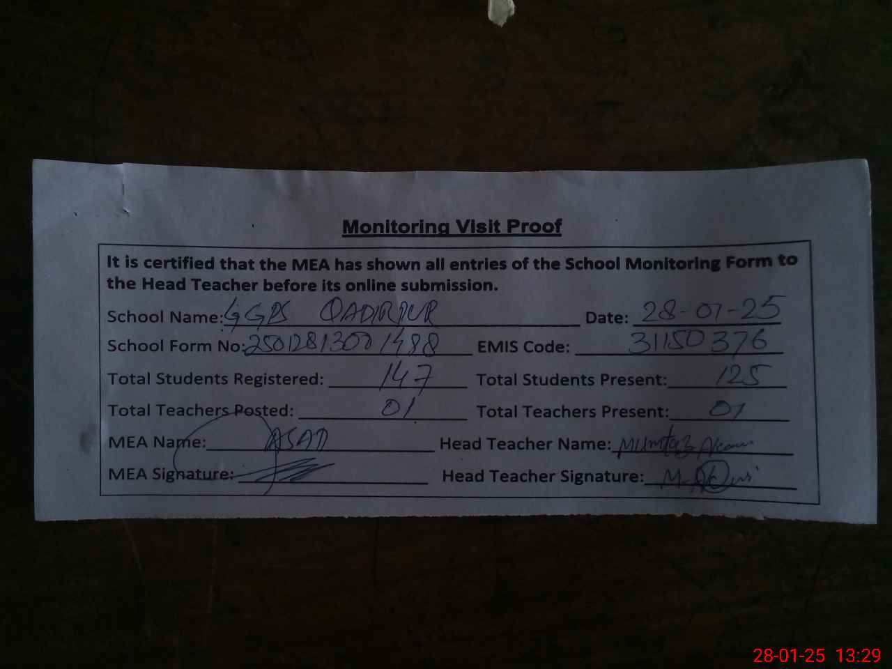 | Attendance Register | Head Teacher | MEA with School | Visit Proof |