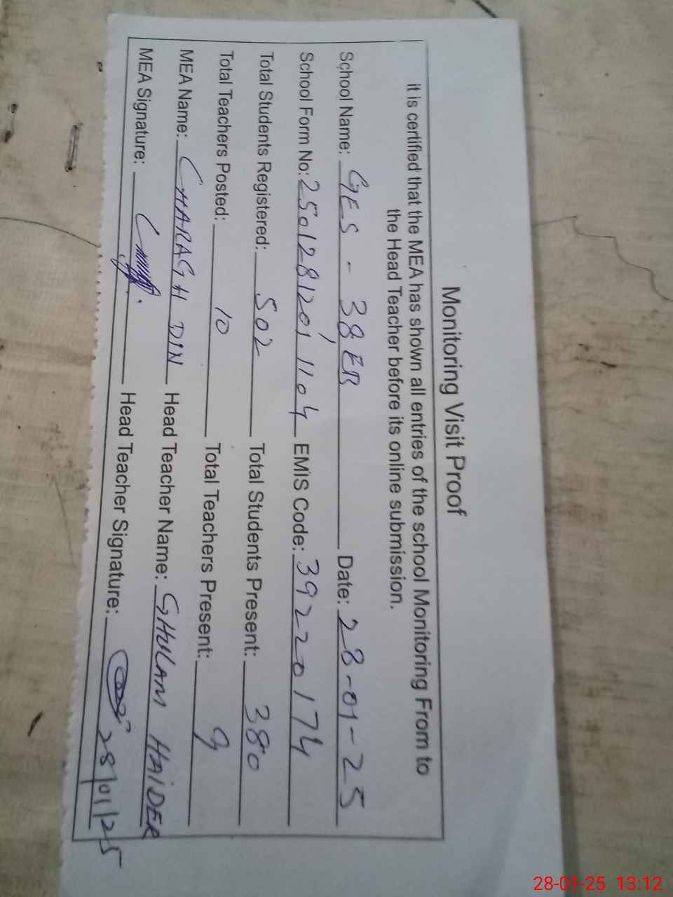 | Attendance Register | Head Teacher | MEA with School | Visit Proof |