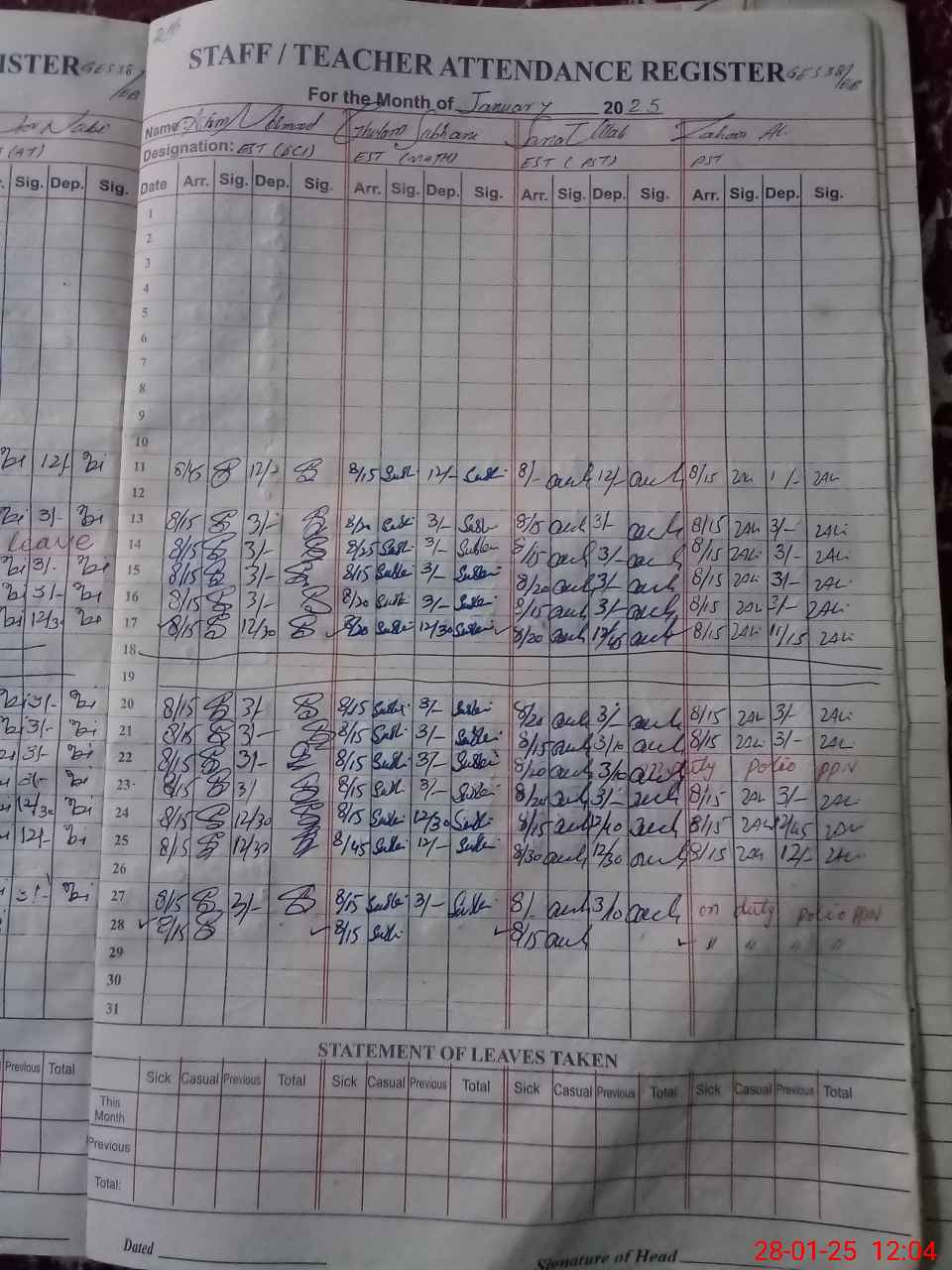 | Leave | Duty | Absent | Maternity | Medical | Ex- Pak |