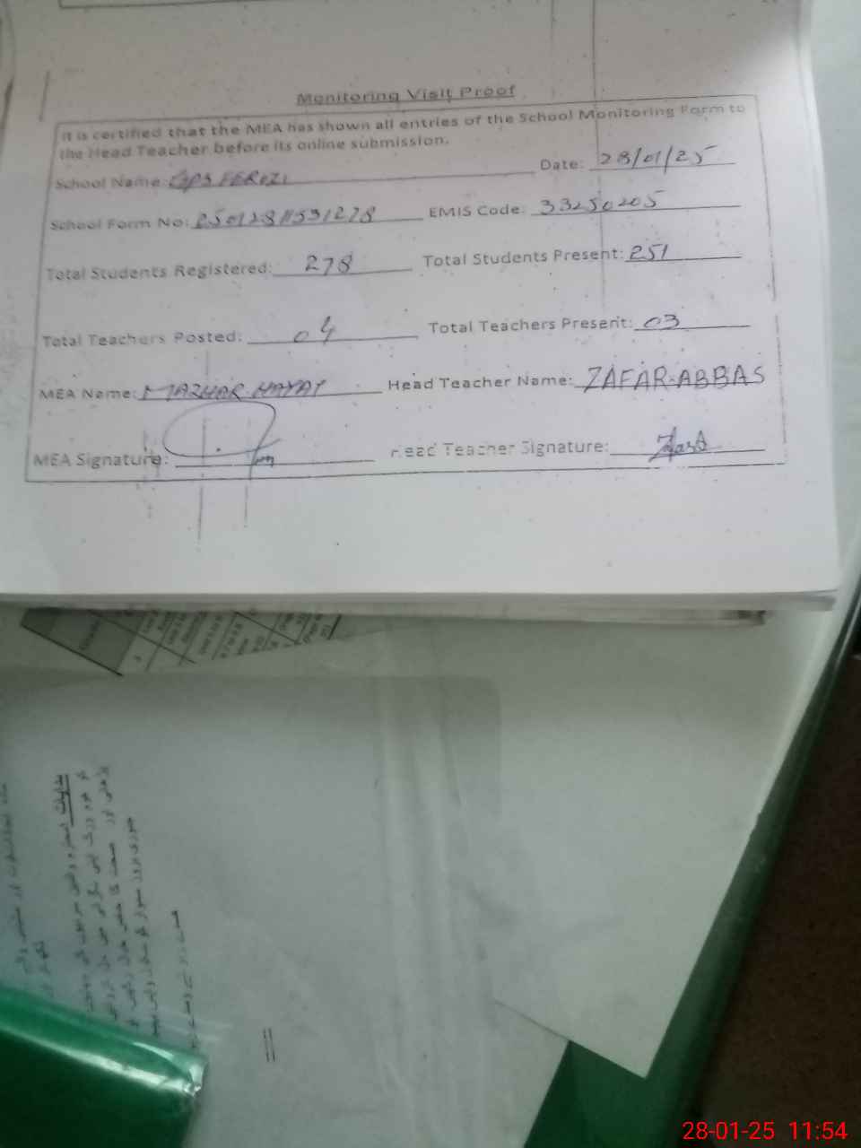 | Attendance Register | Head Teacher | MEA with School | Visit Proof |