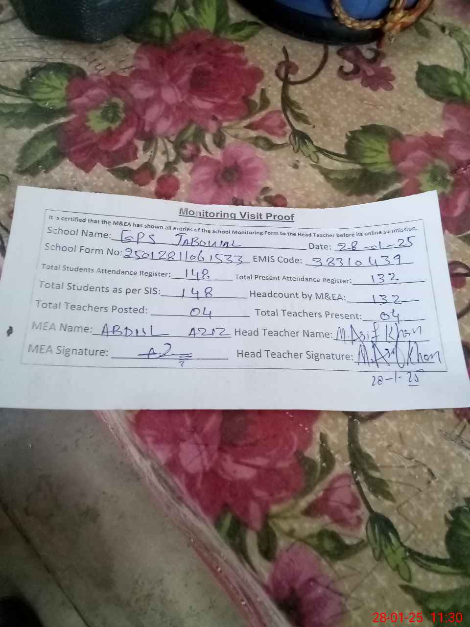 | Attendance Register | Head Teacher | MEA with School | Visit Proof |